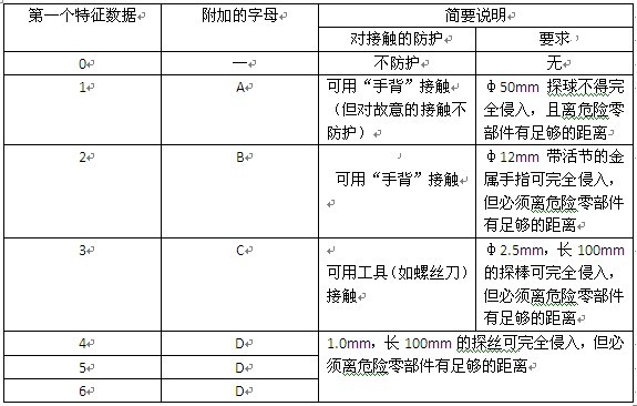備注:接觸防護(hù)的級(jí)別比通過第1個(gè)特征數(shù)據(jù)所標(biāo)注的要高,或者只應(yīng)該標(biāo)注接觸防護(hù)的級(jí)別(第一個(gè)特征數(shù)據(jù)通過X來代替)。通過對(duì)接觸防護(hù),只標(biāo)注一個(gè)防護(hù)級(jí)別,可以將有關(guān)的更低的防護(hù)級(jí)別包括進(jìn)去。
